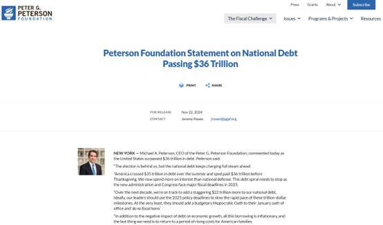 “选举如故收场,但国度债务仍在链接全速高潮,” 意见财政可抓续性的彼得·G.彼得森基金会(Peter G.Peterson Foundation)的首席奉行官迈克尔·彼得森在一份声明中示意。“本年夏天,好意思国的债务卓绝了35万亿好意思元,在感德节前突破了36万亿好意思元。这种债务螺旋式高潮必须罢手。”