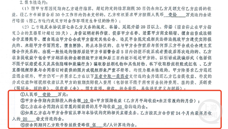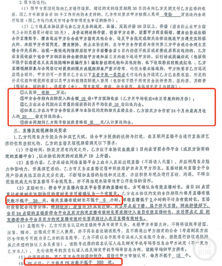上游新闻记者注意到,晓玲和小雅在入职时均签署过一份十多页的《配合公约》,公约除步骤配合期限外,还商定了直播平台、时长及收益分派要求。同期,公约中列举了26项违约要求,最少抵偿金额为10万元,最高将靠近月收益36倍的抵偿。无认定要领的落寞直播,也被列为违约条件之一。《配合公约》商定,直播需要在合约期内每一年完成前台总活水20万元。未完成的,需在3日内向公司返还配合期间公司为主播试验支拨保底费。该公约中还格外标注,两边并非服务合同关系。关于这少量,小雅和晓玲均称订立公约时,公司并非进行详备讲明。