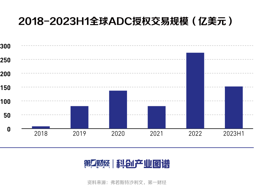 2019年3月,阿斯利康与第一三共达成左券,在寰宇范围内和洽开辟DS-8201,总金额高达69亿好意思元,崇拜开启了ADC对外和洽的序幕。据弗若斯特沙利文统计,寰宇ADC对外授权交往界限捏续增长,狂妄2023年上半年,寰宇ADC药物对外授权款式共计33个,半年内累计交往金额逾越150亿好意思元。