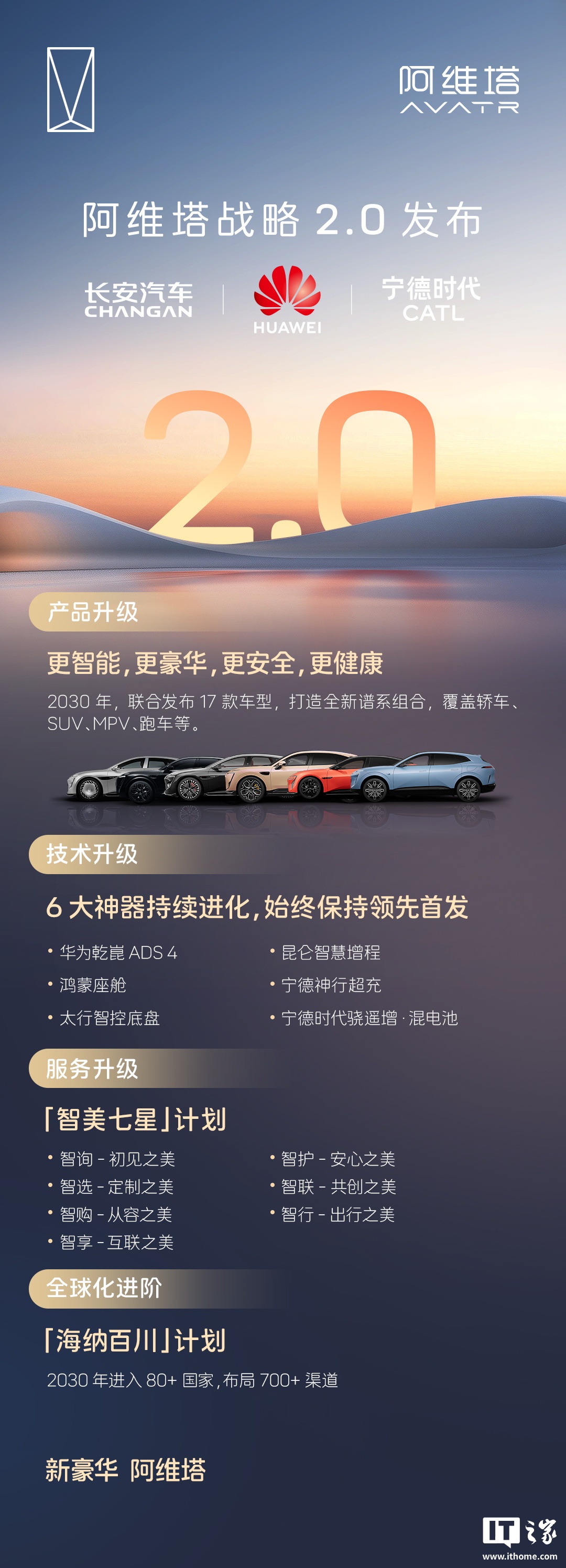 IT之家 9 月 21 日音问,阿维塔战术 2.0 昨晚郑重发布,不时由长安汽车 × 华为 × 宁德期间“满消亡伴东说念主”加合手,声称产物技能职业全维满配升级,将加快民众化进阶。